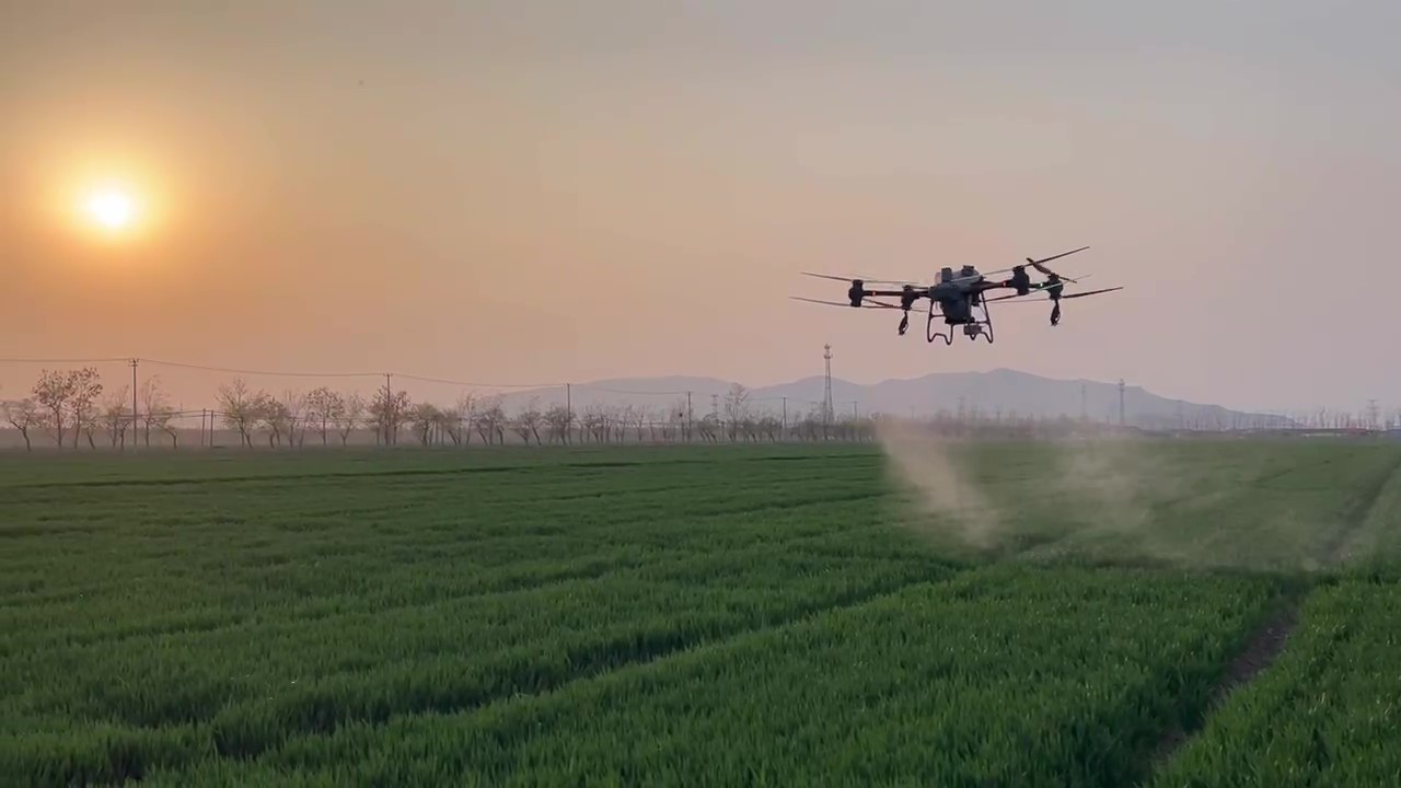 在農牧中心小麥田里,1.3萬畝小麥長勢良好,隨著春風吹拂,泛起陣陣碧色麥浪。一臺臺專業植保無人機在麥田上空來回飛行,開展飛防作業。為保證防治效果,植保無人機畝用水量3L以上,噴幅5-5.5m,飛行速度5m/s,飛行高度2.5m,霧滴直徑130μm。技術員按比例現場精準配比藥水,確保防控效果。對于不方便組織開展飛防作業的地塊,組織人員人工噴灑農藥,確保做到小麥赤霉病農藥噴灑作業無死角。