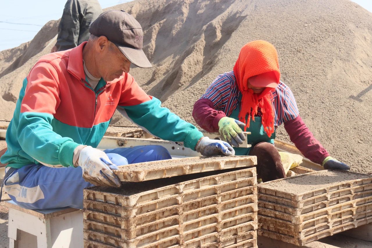 在70大隊,天剛蒙蒙亮,大隊負責人徐玉寶就開始忙碌起來。種子、墊木、床土等育秧物資準備就緒,10余名工人在育秧生產線上進行流水作業(yè),從挑選放置秧盤、填土、灑水、配種、配土到出盤,僅數秒鐘1個育秧盤就下了“流水線”。播種后的秧盤進行集中暗化處理,置于適宜稻種發(fā)芽的暗環(huán)境進行“疊盤”,再用毛毯和塑料布蓋嚴,有效克服外部因素帶來的不利影響。隨著育秧流水線的運轉,機器發(fā)出“吱吱呀呀”的聲響,現場一片熱火朝天的繁忙景象,大家火力全開、奮力沖刺,為實現全年工作目標任務而努力奮斗。
