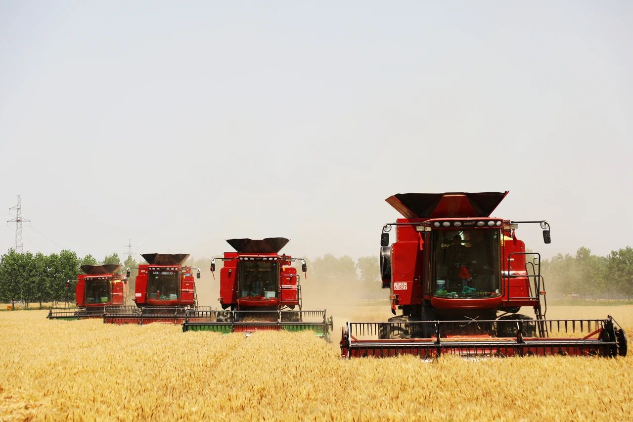 在李塘大隊西區小麥收割現場,麥浪滾滾、機器轟鳴,4臺凱斯4088大型收割機火力全開,一壟壟成熟的小麥被卷進機器,收割、脫粒、除雜一氣呵成,“吞”進去沉甸甸的麥穗,“吐”出來金燦燦的麥粒,金色麥粒傾瀉而下,一臺臺運糧車滿載著豐收的喜悅運轉不停,一派繁忙的豐收景象。界集生產區主任陳玉虎介紹說:“生產區種植小麥面積5240畝,6月2日已正式開啟全面收割工作,我們搶抓有利時節,歇人不歇機,全力組織搶收,做到成熟一片、收獲一片、播種一片。從昨天的收割進度來看,一天可完成小麥收割任務約1000畝,預計5天內全部收割結束,做到小麥應收盡收、顆粒歸倉。”