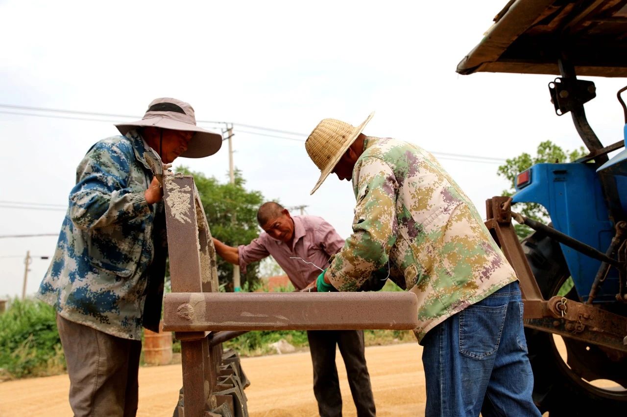 ? ? ? ?正午時(shí)分,在西洋生產(chǎn)區(qū)20大隊(duì)曬場(chǎng),只見工人駕駛著翻糧農(nóng)機(jī),在場(chǎng)面上來(lái)回翻動(dòng)小麥,確保晾曬均勻。休息間隙,駕駛員提前為下午糧食翻曬做好準(zhǔn)備工作,及時(shí)補(bǔ)足燃油,檢查翻糧斗狀態(tài),調(diào)整斗身與地面的距離,一絲不茍地檢查每一個(gè)細(xì)節(jié),確保車輛能夠正常運(yùn)行。麥子在陽(yáng)光的照耀下,散發(fā)出濃郁的麥香。“我們大隊(duì)一共有四面曬場(chǎng),每天晾曬面積可達(dá)500余畝。工作人員及時(shí)測(cè)量糧食水分,達(dá)到烘干指標(biāo)即可送往供應(yīng)貿(mào)易部烘干?!?0大隊(duì)隊(duì)長(zhǎng)吉寶玉說(shuō)。曬場(chǎng)工作人員每天十點(diǎn)開始糧食翻曬工作,平均1小時(shí)翻曬1次。除晾曬糧食,還要時(shí)刻關(guān)注天氣變化,一旦遇到陰雨天氣,立即組織人手,將麥子集中成堆,用皮紙、口袋壓緊、壓實(shí),以免受潮發(fā)霉。