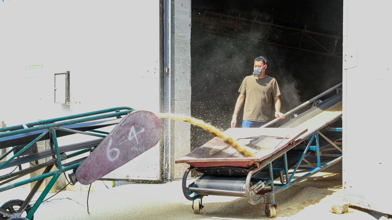 除夏糧搶收,糧食烘干也是保障糧食品質、確保糧食豐收的關鍵。走進供應貿易部烘干現場,滿載著剛收獲小麥的運糧車一輛輛駛入大門,過磅、卸糧、烘干、采樣化驗、出倉入庫……“轟隆隆,轟隆隆......”烘干房內機器轟鳴,傳送帶源源不斷地將小麥輸送至烘干機內進行烘干作業,后通過傳輸帶直接進入糧倉儲存。據悉,東辛10條烘干線24小時開足馬力工作,日烘干量達4640噸。