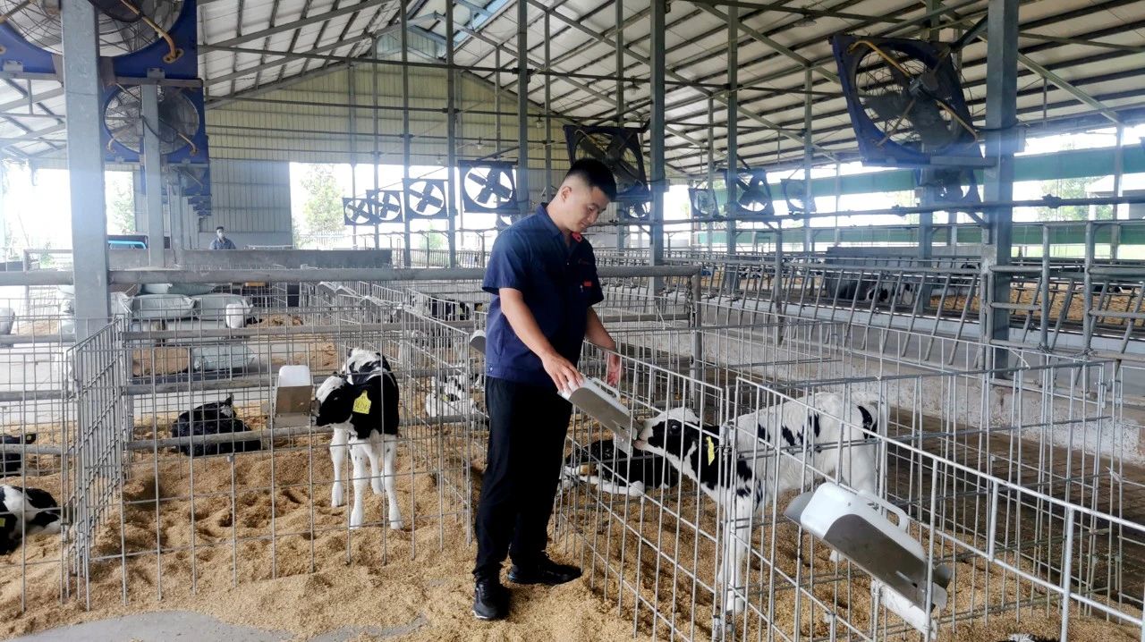 蘇墾優然牧業公司犢牛舍內,產房部部長林通身著工作服,手持精心準備的犢牛專用奶瓶,一邊給新生牛犢喂奶,一邊微笑著說:“新生犢牛在1小時內要飲用體重10%的初乳,6小時后再次飲用2升初乳,我們嚴格執行的喂養流程是小家伙們健康成長的重要保障。”產房內,林通嚴謹細致地檢查著周圍的環境,“最近是奶牛的生產高峰期,我們的產房24小時都有專人值班,根據奶牛的預產期,提前做好產房、產間及所有器具消毒等產前準備工作,確保生產環境干燥、舒適。”問及沒有和家人一起過中秋是否覺得遺憾,林通淡然一笑:“養殖人堅守生產崗位是我們的本職工作,每一頭新生的犢牛能在安全和舒適的環境中降生就是我的愿望,和小家伙們度過的中秋怎么不算一個團圓佳節呢。”