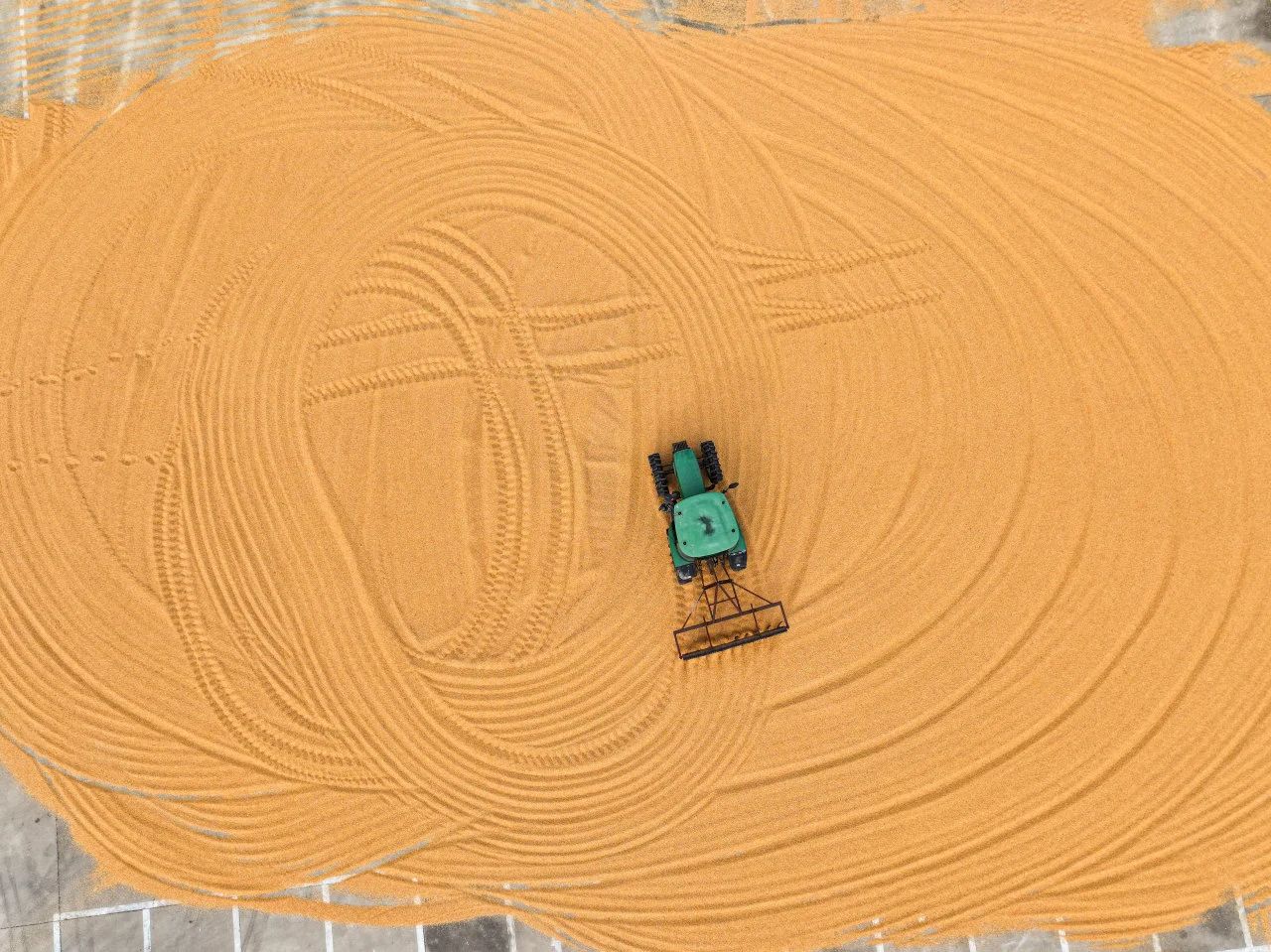 走進(jìn)東辛農(nóng)機(jī)總站翻曬現(xiàn)場,只見農(nóng)機(jī)操作人員正駕駛著翻曬機(jī)械來回穿梭作業(yè),大片金色的玉米籽粒被均勻地鋪開晾曬,呈現(xiàn)出一派機(jī)器轟鳴、熱火朝天的繁忙豐收景象。