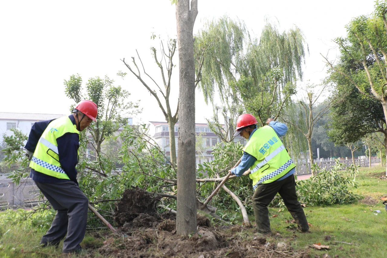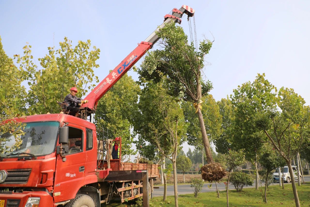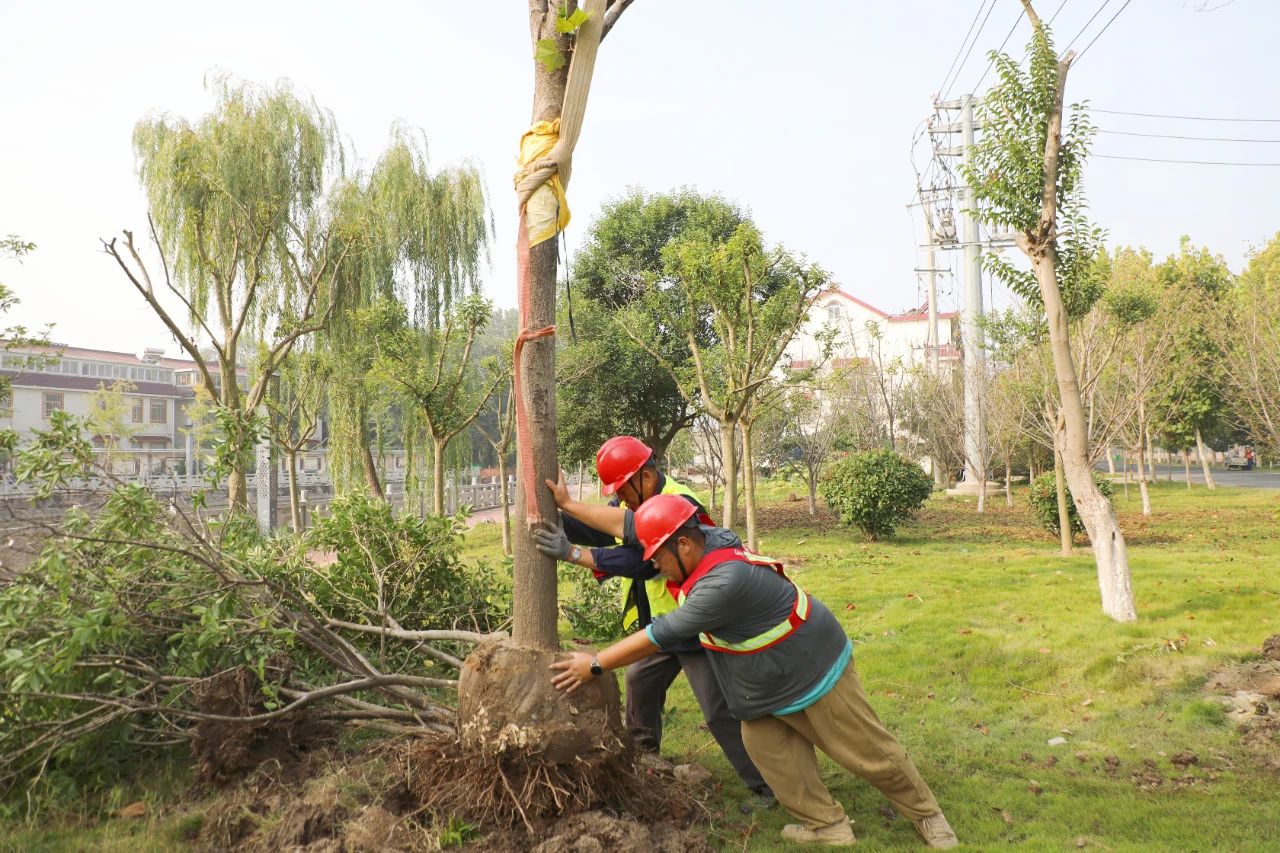 在耕耘橋西側城鎮綠化區域內,7棵遮擋標志牌的高桿女貞即將“搬家”落戶于此,工人們三兩配合,將苗木放至提前挖好的土穴內。項目負責人翟光楷介紹說:“修剪和移栽兩個步驟同時進行,苗木移栽成活率受氣候、土質、水分等多種因素影響,工作人員加班加點,僅用3天時間便保質保量完成了苗木移栽工作,并對綠化帶中空缺部分進行了紅葉石楠小苗補種,讓城鎮綠化帶既美觀又安全。”