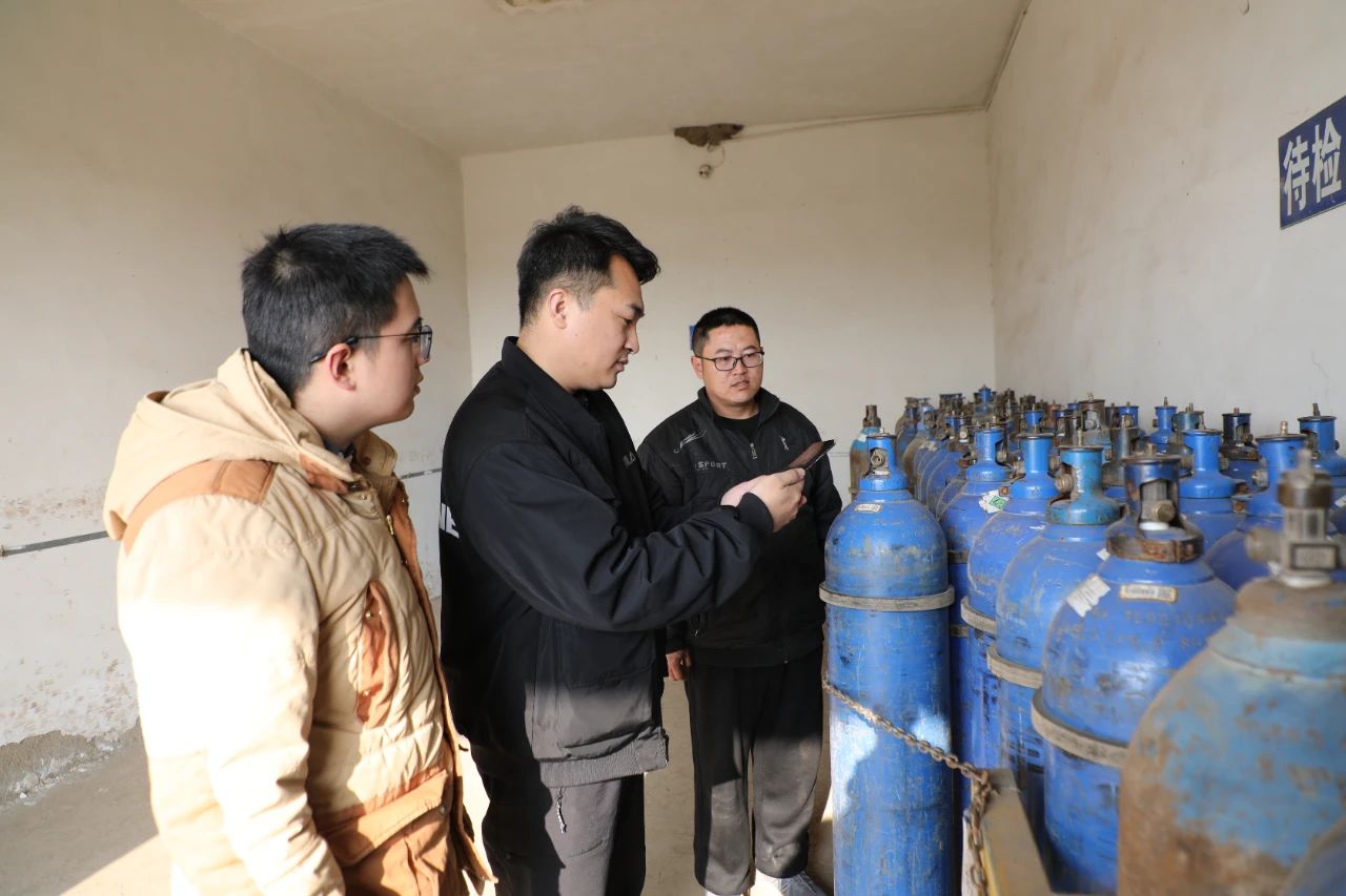 在曉春氣體充裝站,檢查組隨機抽取氣瓶進行掃碼,查看氣體充裝時間和氣瓶檢測時間,是否嚴格按照充裝規定進行作業,充裝人員是否持證上崗,是否存在充裝過期未檢、標志不清的不合格氣瓶等,并現場檢查儲氣罐、裝卸區、充裝臺、氣瓶堆放等重點區域的安全管理情況,核實特種設備、安全保護裝置及附件的定期檢驗以及氣瓶充裝前、中、后的檢查和充裝記錄情況。檢查組強調,充裝站要按規定粘貼氣瓶警示標簽,定期對氣瓶進行檢驗,處置好報廢氣瓶,做好安全隱患排查,切實預防消防安全事故的發生。