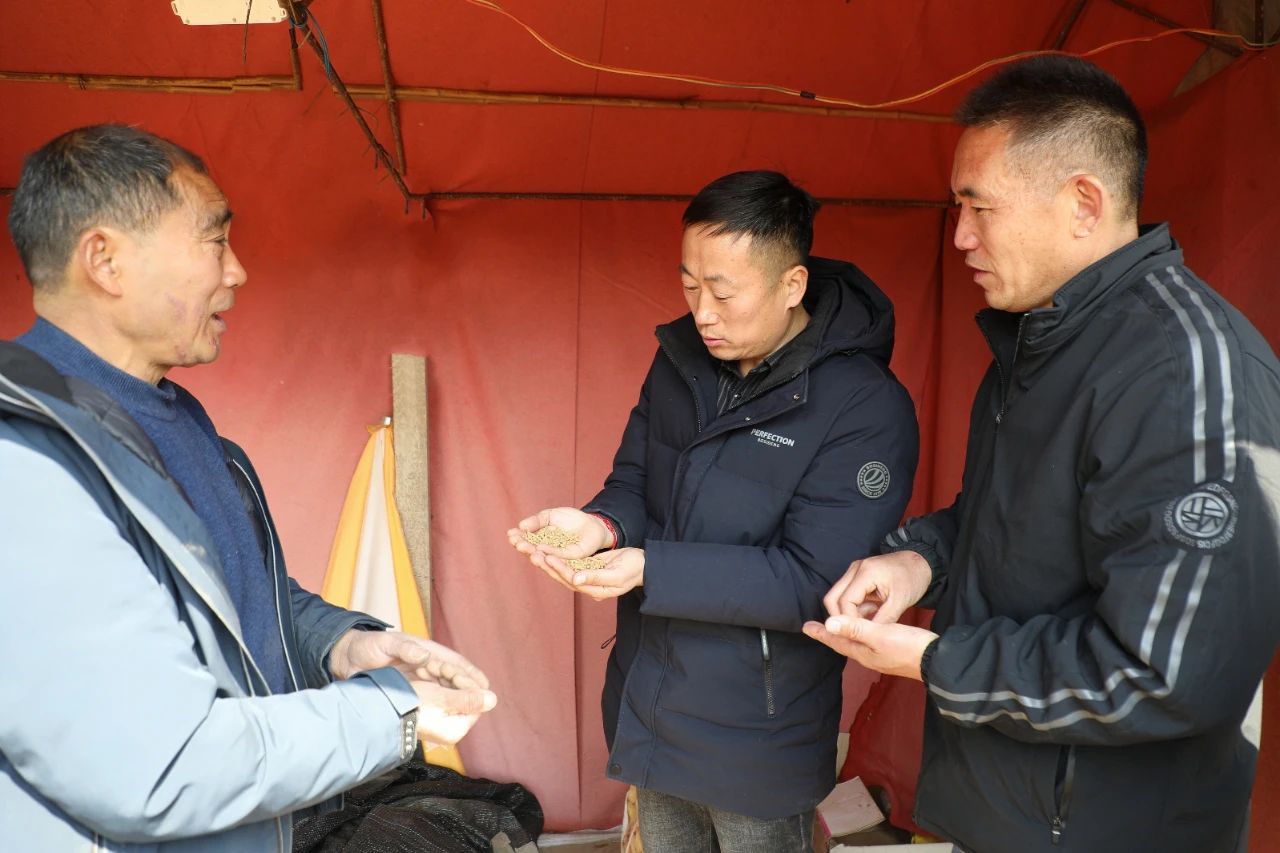 孫道鵬和沙鷗在與農(nóng)戶們交談中了解到,藍(lán)莓果樹(shù)喜酸性土壤環(huán)境,且為了提升果實(shí)口感,農(nóng)戶們會(huì)將豆粕和發(fā)酵后的大豆拌入土壤,但由于把握不好基肥和微量元素等添加量,且藍(lán)莓根系嬌嫩脆弱,很容易傷根,影響果園產(chǎn)量和種植戶收益。在聽(tīng)到農(nóng)戶訴求后,孫道鵬立即與沙鷗現(xiàn)場(chǎng)討論配方改良,根據(jù)黑林鎮(zhèn)土壤特性和藍(lán)莓生長(zhǎng)習(xí)性,決定在現(xiàn)有樣品中適當(dāng)添加菌劑和發(fā)酵過(guò)的顆粒大豆,使得改良后的藍(lán)莓專用肥更加符合農(nóng)戶需求。在種植大戶老徐的帶領(lǐng)下,周邊藍(lán)莓種植戶紛紛前來(lái)學(xué)習(xí)交流,并表示自愿劃出一塊區(qū)域用于后續(xù)有機(jī)肥改良試驗(yàn)推廣。