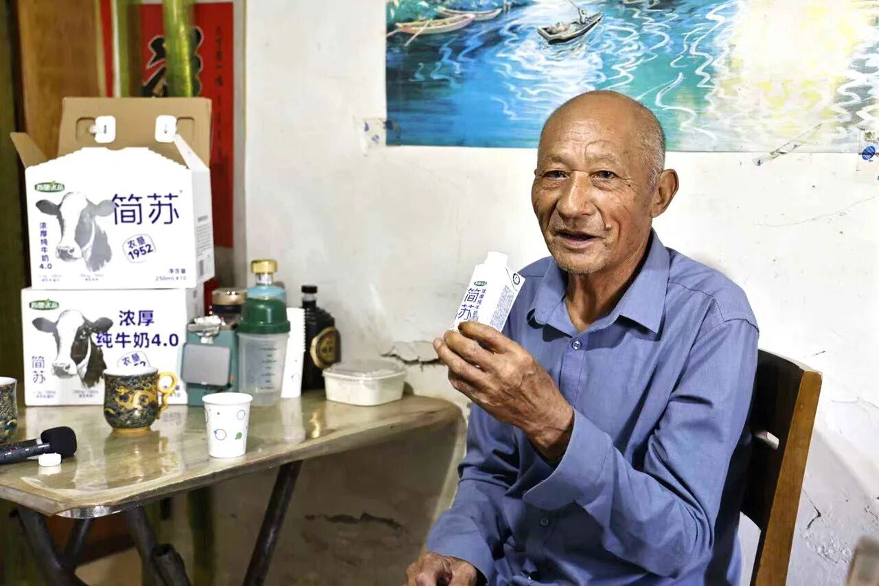 雖年事已高,古善明仍堅持每天一杯奶。接過“簡蘇”牛奶細品后,他說:“很香濃,還是從前的味道。”老人又關切詢問銷售情況,得知不僅線下商超有售,還能通過網絡銷往全國各地,他的臉上頓時露出笑容。被問及“想對現在的年輕人說些什么”,他沉吟片刻,緩慢卻清晰地說:“做事要實誠、憑良心,我送奶從不短斤少兩?!苯又謴娬{:“做事一定要有實干精神,干事業別光圖快、圖利,路是一步一步走出來的。咱農場人靠的就是真誠厚道,對土地真,土地就給好收成;對奶牛真,奶牛就能產出好奶?!边@樸素話語背后是穿越歲月依舊鏗鏘的價值信念。
