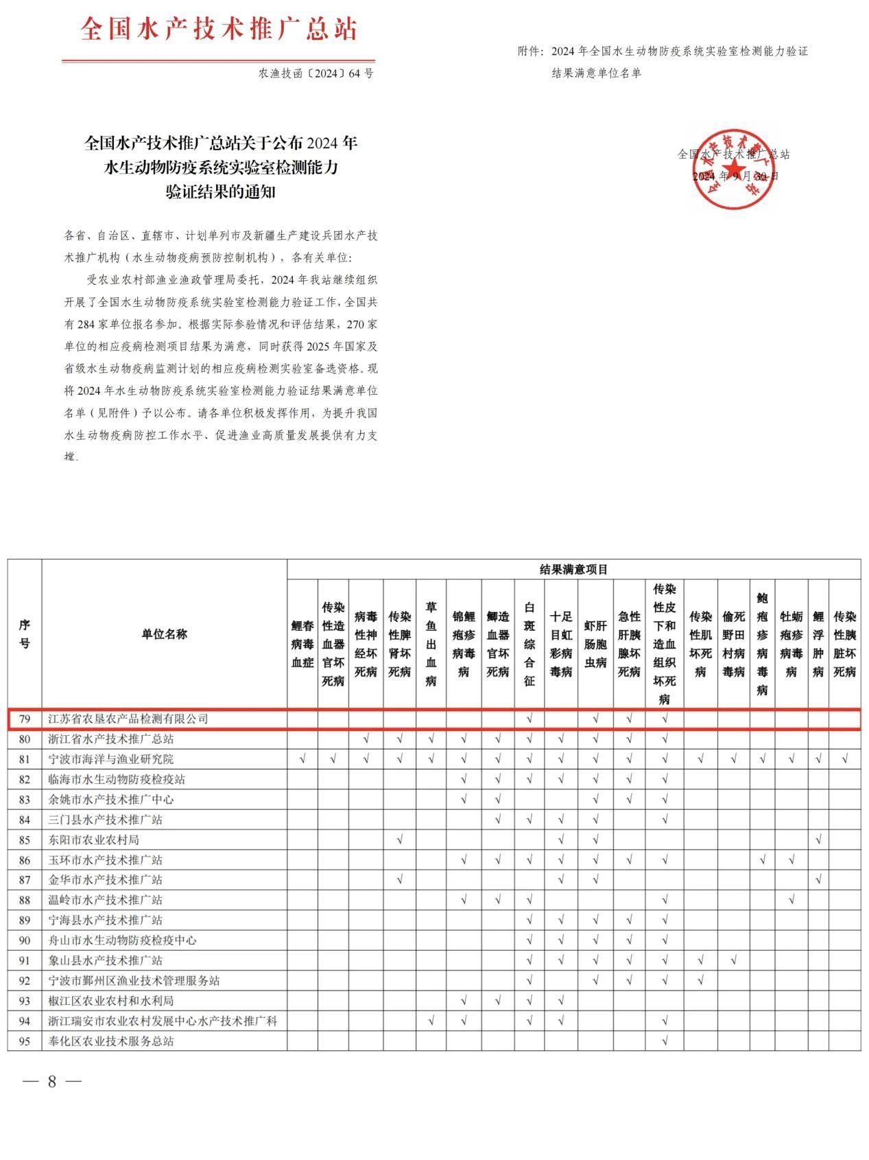 近日,全國水產技術推廣總站公布了2024年全國水生動物防疫系統實驗室檢測能力驗證結果,江蘇農墾農產品檢測有限公司參報的甲殼類急性肝胰腺壞死病、白斑綜合征、蝦肝腸胞蟲病、傳染性皮下及造血組織壞死病4種疫病病原檢測項目結果均為滿意,并獲得2025年國家及省級水生動物疫病監測計劃的相應疫病檢測實驗室備選資格。