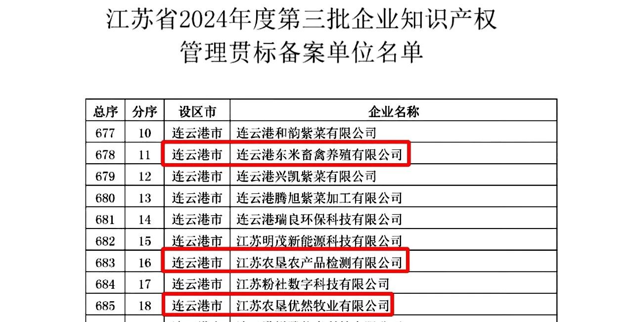 近日,江蘇省知識產權局公布了江蘇省2024年度第三批企業知識產權管理貫標備案單位名單,江蘇農墾優然牧業有限公司、連云港東米畜禽養殖有限公司與江蘇農墾農產品檢測有限公司3家單位榜上有名。