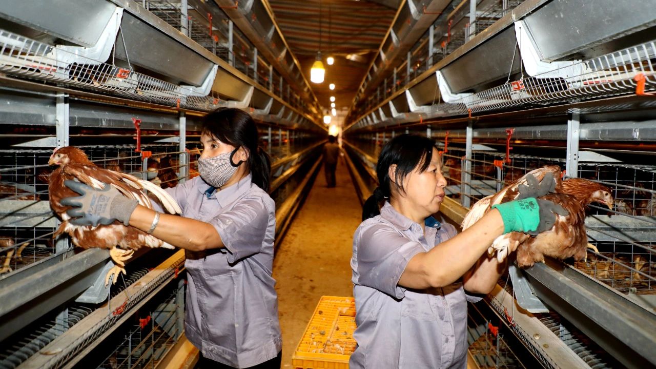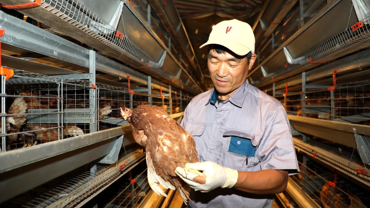 走進4層5列的智能化雞舍,工人們正有條不紊地為蛋雞進行體檢,并嚴格按照每籠6羽的標準分裝入籠。在溫濕度精準調控、光照智能調節的舒適環境中,“新住戶”們很快適應,有的悠閑踱步,有的專注啄食,一片生機勃勃。