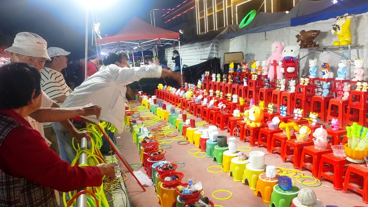 走進(jìn)燈火通明的夜市,蒙古烤肉滋滋作響,冰激凌攤位前擠滿了孩童,鐵板魷魚的焦香令人垂涎欲滴。玩具槍射擊攤位前,人們屏息瞄準(zhǔn)氣球,“啪啪”聲與歡呼聲此起彼伏。套圈場地圍滿了人群,居民張大爺剛剛套中一個(gè)裝著兔子的籠子,孫子拿著兔籠興奮地跳起來:“中了!爺爺真厲害!”一旁的海盜船高高蕩起,引得孩子們陣陣尖叫。旋轉(zhuǎn)木馬在彩色燈光的映照下,為家長和孩子臉上投下幸福的光斑。煙火氣與居民幸福感在這里完美交融。