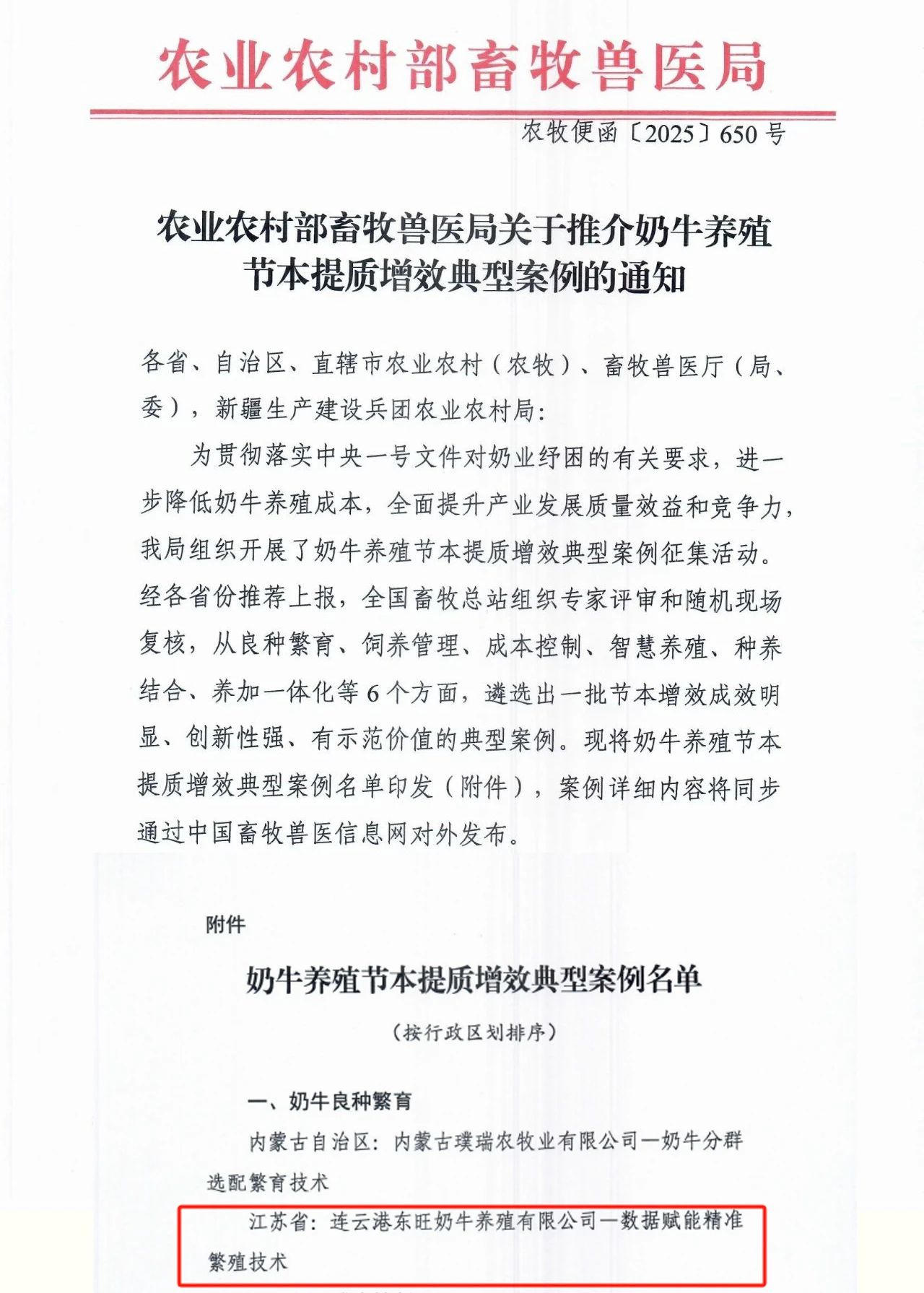 近日,農業農村部畜牧獸醫局公布了全國奶牛養殖節本提質增效典型案例遴選結果,東辛農場東旺奶牛公司憑借其“數據賦能精準繁殖技術”成功入選,成為江蘇省三家上榜企業之一。