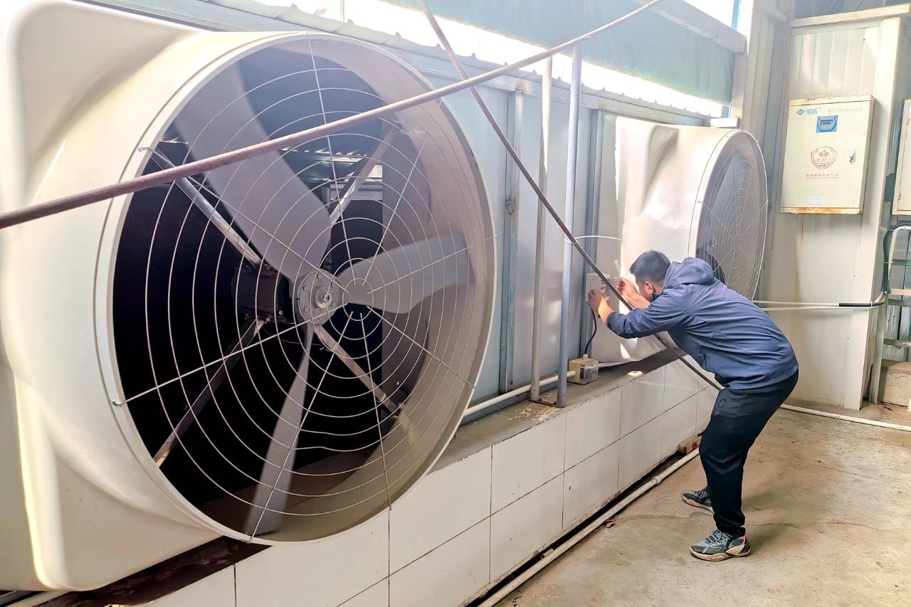 “低溫新風系統就是濕簾和風機組合,把清新的冷空氣吹向牛群,讓奶牛周圍的空氣壓力提高,增加空氣密度,提高攜氧量,讓奶牛呼吸順暢、體感清涼舒適。”養殖三場奶廳廳長盧志國一邊檢查維護低溫新風系統組件一邊介紹道。今年養殖場實行不停配,產犢高峰提前到7、8月份,未雨綢繆做好奶牛防暑工作是牧場當前工作的重中之重。奶牛耐寒不耐熱,對高溫、高濕特別敏感,較高的溫度會讓奶牛采食量下降,導致產奶量降低,奶牛的免疫力也會降低。此外,高溫高濕的環境還極易滋生細菌,給疫病防控帶來困擾。